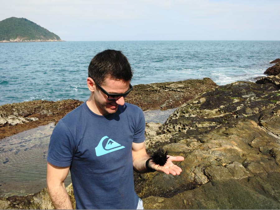 Outra dica é dar a volta na parte de baixo, por cima das pedras, passando pelas piscinas naturais. Ali vimos ouriços e até peixinhos nas piscinas que se formam no local. No final desse caminho você vai encontrar umas pedras que formam uma espécie de gruta, que vão render fotos muito legais.