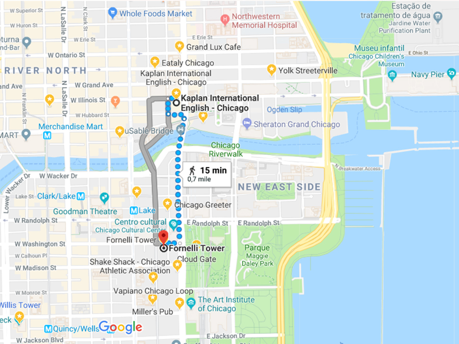 O Danilo da CI Faria Lima (nossa agência de intercâmbio), nos mostrou que uma das opções oferecidas pela Kaplan International Chicago era o Fornelli Tower. Ao traçar a rota até onde estudaríamos, vimos que ficava a 12, 15 minutos a pé da escola. Perfeito né? Isso nos fez pensar que estando no centro e próximo da escola poderíamos aproveitar melhor a cidade nas duas primeiras semanas de aula.