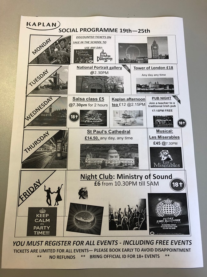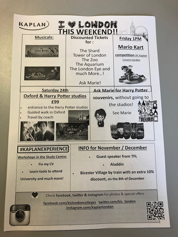 Marie era a pessoa responsável pelas atividades extraclasse da Kaplan Leicester Square. Além de possibilitar que você conheça lugares diferentes, é uma oportunidade legal para interagir com outros alunos e praticar inglês. Bastava olhar a programação e falar com a Marie para pegar dicas e comprar os ingressos. Ela estava praticamente todos os dias no andar da recepção e é uma simpatia de pessoa!