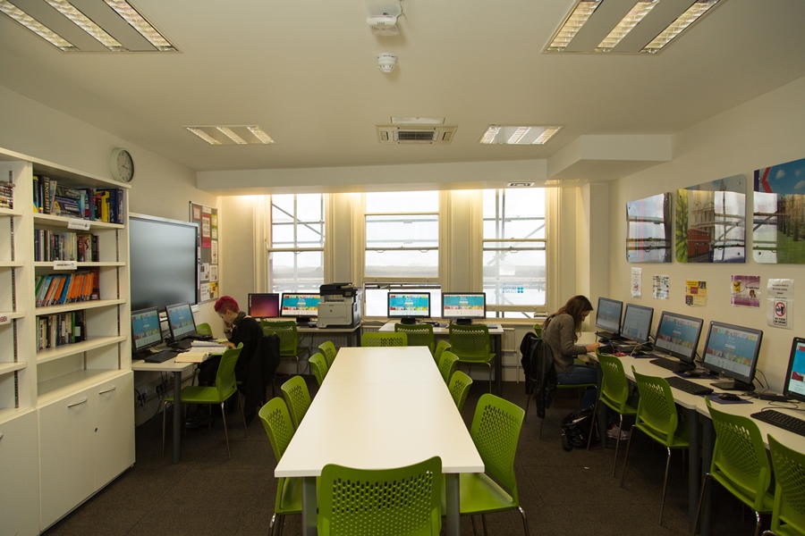 Ao lado do café tem uma sala (Computer Lab/Multimedia Centre) com vários computadores para quem deseja fazer pesquisas, etc. Outra sala bastante utilizada é o Study Centre, que possui uma estrutura bem legal para o estudante se manter em contato com o idioma. A escola disponibiliza vários livros para você levar se quiser ler fora do horário de aula.