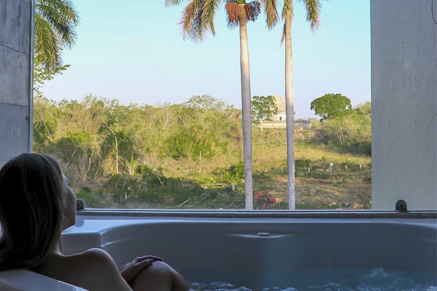 O Mayaland Hotel tem quartos espaçosos, com opção de bangalôs ou suítes, como a nossa. A propriedade inclui mais 2 hotéis da rede e conta com um planetário maia e 4 restaurantes, que servem a autêntica culinária maia. O café não está incluso na diária, mas tem muitas opções de menu e valeu a pena. E não poderíamos deixar de aproveitar um banho na banheira de hidromassagem com vista para o Observatório Maia, né?