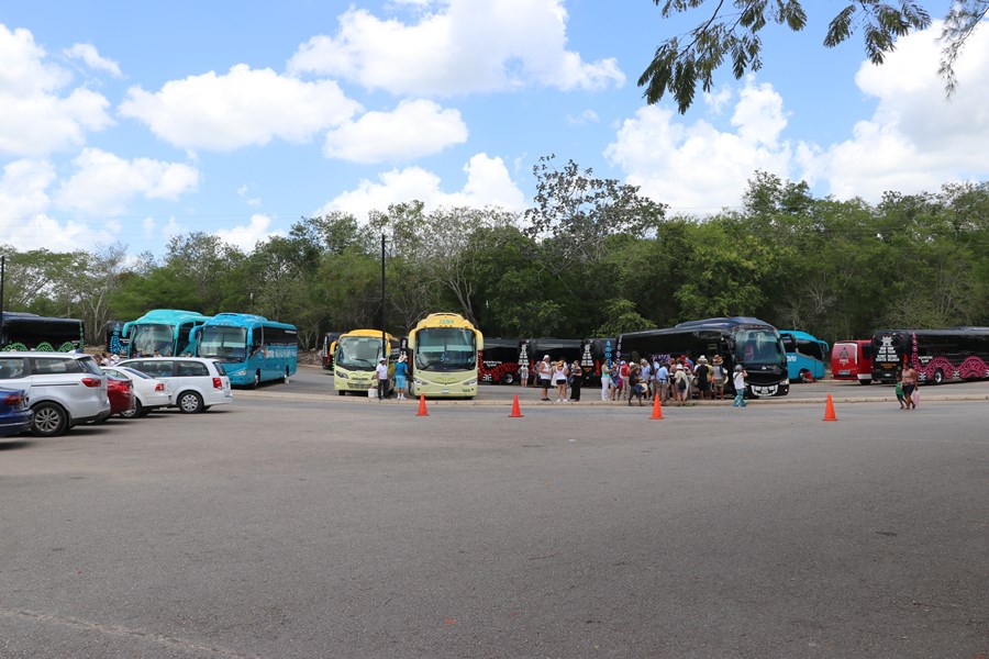 Pra quem está em Cancún, Playa del Carmen ou qualquer cidade do litoral, a maneira mais comum é por excursão. Vimos muitos ônibus, muitos mesmo! Todos os hotéis vendem esse tipo de passeio, que também pode ser encontrado dando uma volta no centrinho de cada cidade. O que precisa considerar é que ao comprar uma excursão, você estará chegando possivelmente no mesmo momento em que diversas outras. Ou seja, vai pegar fila e o lugar lotado.