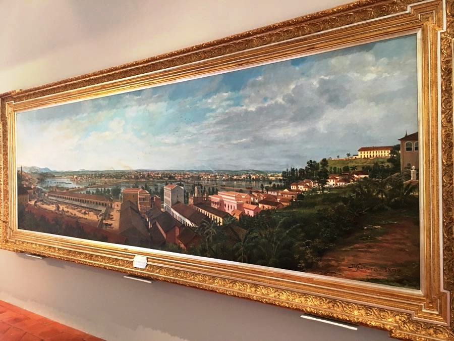 Outra obra que nos fez parar por mais tempo e observar foi a “Inundação da Várzea do Carmo (SP) 1892”. Um quadro em formato diferente, panorâmico (medindo 125 x 400cm), com moldura grossa e dourada. É um óleo sobre tela riquíssimo em detalhes do artista Benedito Calixto. Mesmo nos pequenos traços dava pra ver cada folhinha, cada janela e as pessoas do quadro com perfeição.
