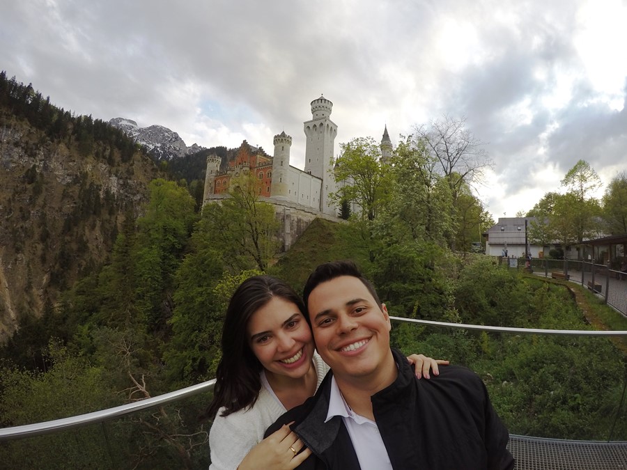 Como o desapego não é um hábito do casal aqui, gastamos algumas horas do lado de fora do Castelo, contemplando e procurando o ângulo ideal para a foto perfeita. Até que meu amado namorado começa a me encher de aparelhos eletrônicos. Primeiro um foninho amarelo (minha face já azeda!), depois um celular, em seguida ele saca o Ipad e posiciona na mureta que separa o Castelo do precipício (já não sei se fico tensa ou se brigo por causa do foninho) e pra piorar a nossa GoPro novinha é colocada na mesma muretinha (ainda bem que estamos na Alemanha e arrastões não são uma moda por lá!).