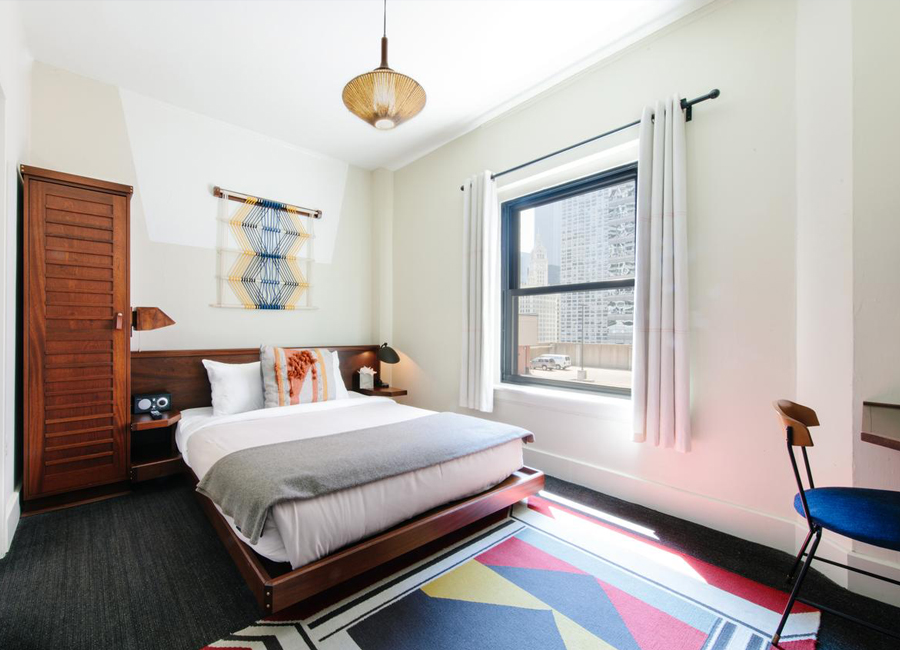 Vantagens: Esse hotel fica no bairro de River North, portanto, um pouco acima do loop. Muito procurado por jovens e casais, ele tem um clima animado e conta com um badalado bar/restaurante, o Broken Shaker. Todos os seus quartos têm ar condicionado e mesa de trabalho. Além disso, os quartos privativos possuem TV. É possível também se hospedar na Penthouse, que é um duplex com 2 quartos. O Freehand tem máquinas de lavar/secar roupa self-service e academia. Com a finalidade de facilitar a vida de quem quer economizar nas refeições, tem em sua estrutura uma cozinha comunitária.