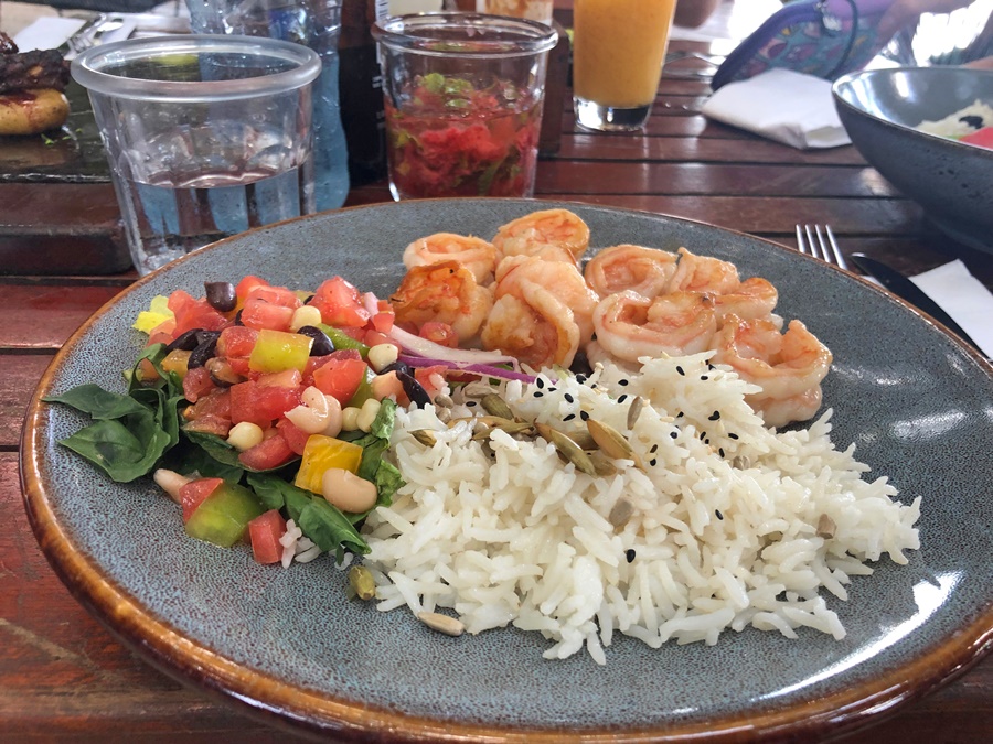 Eu (Lu) pedi um polvo grelhado que estava muito bom. Levemente apimentado, acompanhava batata e um molho abacate. A Grasi comeu um camarão, que seria apimentado, mas ela pediu para reduzir a pimenta, retirando o molho. Acompanhava arroz e uma salada verde com tomate, pimentão e feijões. Ambos estavam excelentes!
