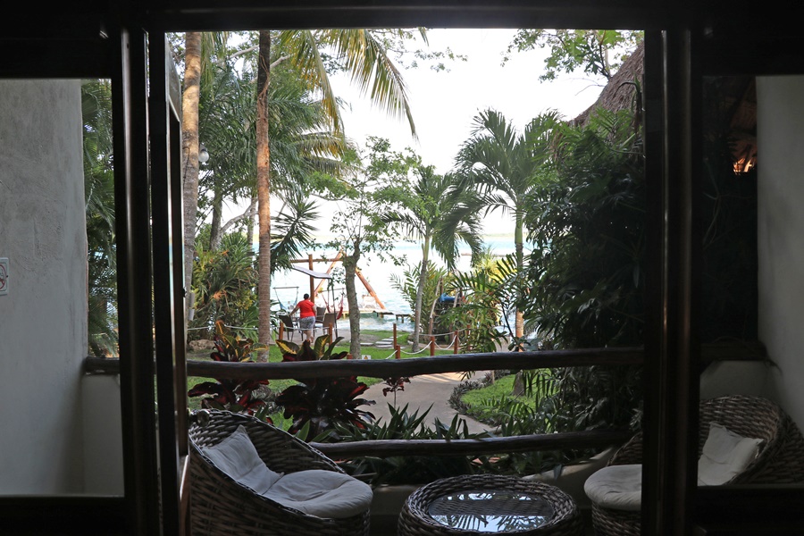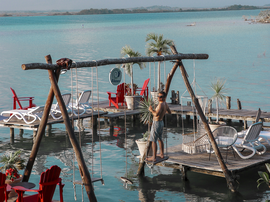 Se agente indica? Sim! Pelo quarto, pelo visual. Os balanços ali na frente da lagoa proporcionam ótimas fotos em um espaço muito relaxante quando não está lotado. Pois é, como o local é aberto para day use, pode chegar bastante gente durante o dia. A sacada era aproveitar cedinho e o final de tarde. Inclusive nos dois dias que estivemos por lá, acordamos às 6h para ver o inesquecível amanhecer da Laguna de Bacalar – dá um look na foto abaixo.