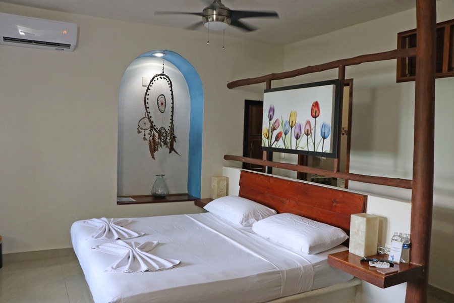 No nosso apartamento tinha varanda, ar-condicionado, ventilador, era bem espaçoso, com chuveiro e cama bons. A nossa era a Suíte Júnior 2 e a diária saiu por 280 pesos – 569 reais.