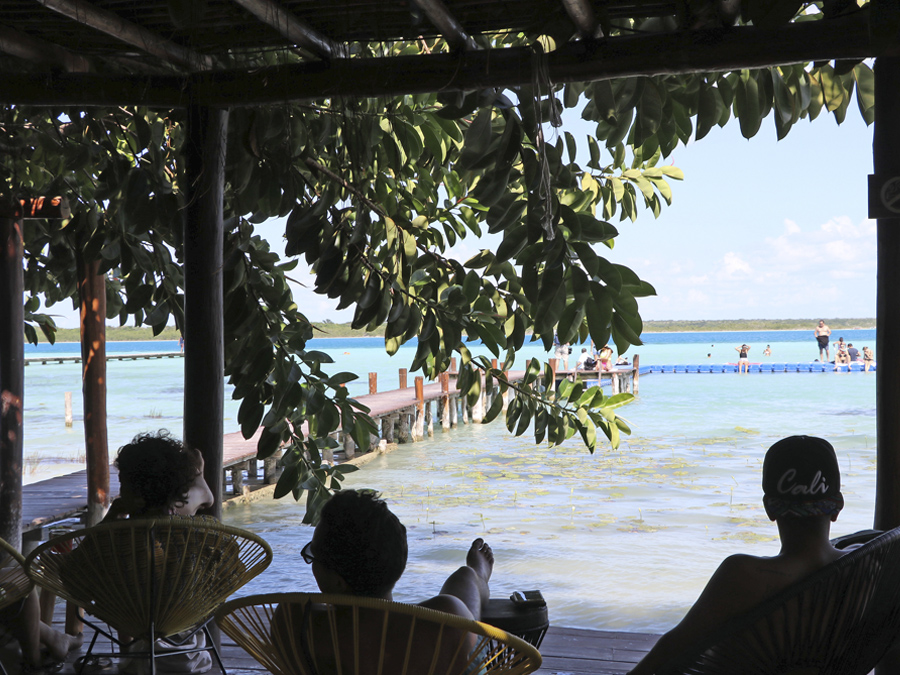 No nosso último dia em Bacalar fomos almoçar no La Playita. Ele estava bem colocado no ranking do TripAdvisor e valia a pena conferir. Realmente é um tiro certeiro. O cardápio é amplo, e o local muito bonito à beira da lagoa. Aproveitamos para fazer umas fotos no deck e curtir o visual. O nosso amigo Rodrigo até deu um cochilo nas espreguiçadeiras super confortáveis que tinham por lá, hehe.