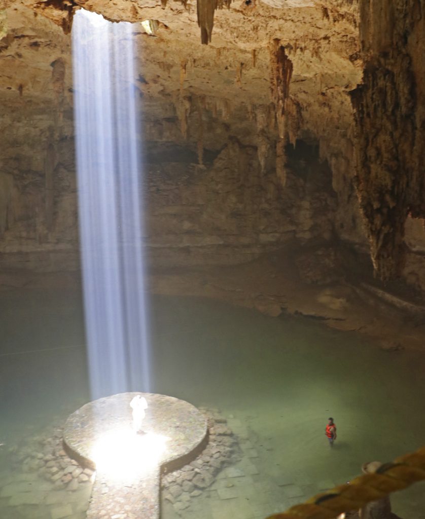 Outro campeão de beleza, que você precisa visitar é o Cenote Suytún – na língua maia significa “centro de pedra”. O nome faz alusão ao seu formato, pois possui uma plataforma que paira sobre as águas. Ele fica fora de Tulum, em uma cidade chamada Valladolid que você chega em 1h15 de carro. A formação desse cenote é impressionante! Ele é imenso! É como se você estivesse dentro de um ginásio de esportes. Nele, a única abertura que permite a entrada de luz é um buraco de 1,5m de diâmetro lá no alto, no centro.