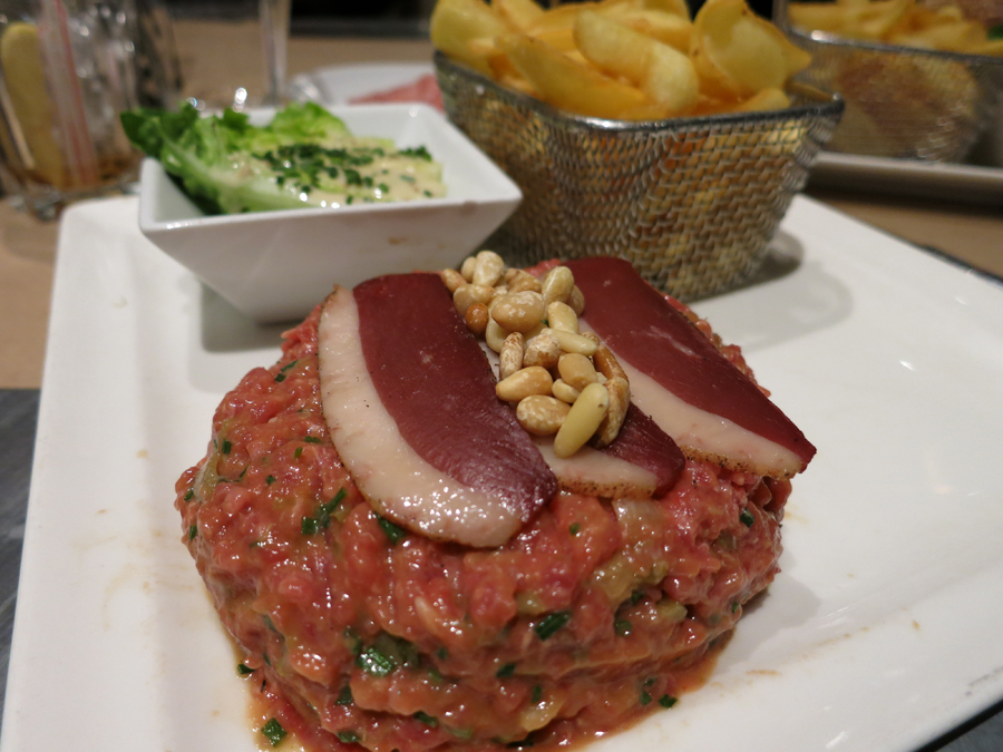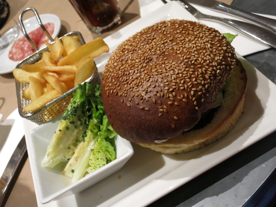 Jantamos no La Potiniére, um restaurante que além de comida francesa, possuía outras opções mais familiares para nós. Eu pedi um Steak Tartar e a Grasi, hambúrguer. Esse local é super charmoso e fica praticamente em frente ao Palácio dos Festivais.
