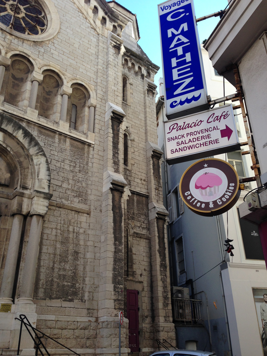 Procuramos um lugar pra tomar café da manhã, e seguir nossa caminhada. Achamos o Coffee & Cookies, um lugar bem agradável em frente à Catedral de Notre Dame, que fica na rua paralela à Boulevard de La Croisette. Pedimos cafés e waffles que estavam deliciosos. Entramos um pouquinho na catedral pra conhecer e voltamos para a beira mar.