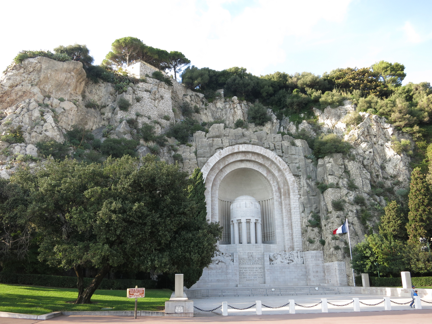 Ah, e no caminho vimos uma construção imponente encrostada em um dos morros (Colina do Chateau), era o Monumento aos Mortos da Guerra, ele fica nas proximidades do estacionamento, próximo à entrada do porto. Esse memorial foi inaugurado em 1928 e presta homenagem a 4 mil moradores de Nice mortos na Primeira Guerra Mundial. Muito bonito, todo branco, não tem como não chamar a atenção.