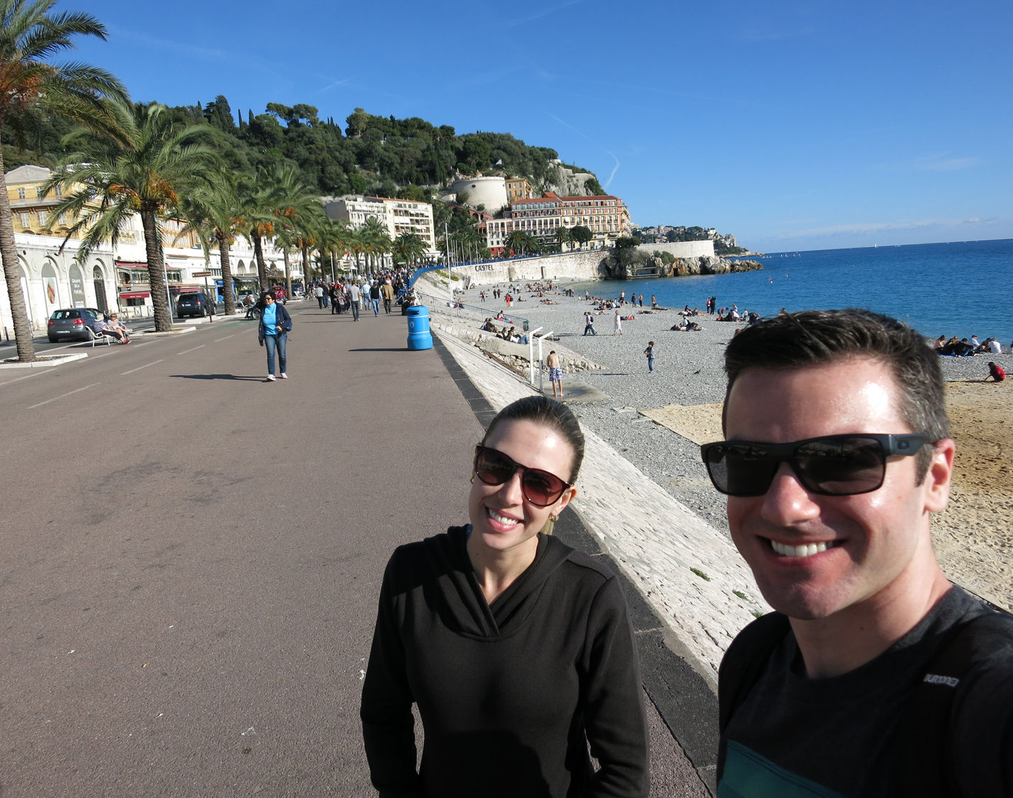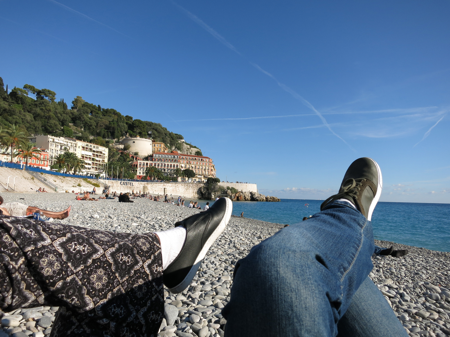 Andamos por ali, tiramos umas fotos e após o almoço, resolvemos aproveitar o solzinho para ir até a praia relaxar um pouco. Com a vista de um lado para o Centro Histórico e de outro para o mar com aviões cruzando o céu (esse local é rota dos aviões que chegam e pousam no aeroporto de Nice). Uma parte da praia é de areia, mas a maioria é de pedrinhas, aquelas pedrinhas cinzas bem redondinhas, sabe? E olha só, o povo fica lá deitado, dorme de babar com relógio, calçados, bolsas e até malas do lado des-preo-cu-pa-da-mente-te. Sim, porque lá é seguro e você pode curtir uma soneca na praia sem preocupação. Legal não é?